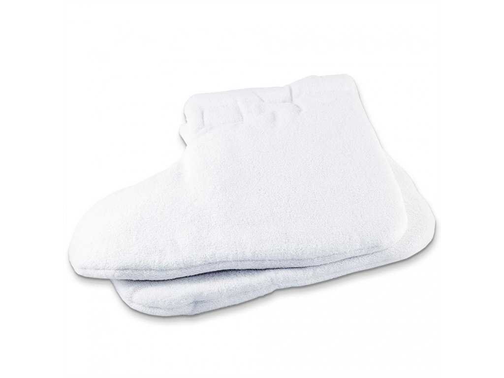 Veľmi kvalitné biele froté návleky na nohy so suchým zipsom pre efektívne utesnenie pred únikom tepla. Postup pri parafínovom zábale nohy je nasledujúci. Rozohrejeme parafín na požadovanú teplotu v parafínovom kúpeli. Nohu umyjeme a dôkladne osušíme. Prevedieme ponor do parafínu, ktorý 3x opakujeme. Je nutné na nohe vytvoriť súvislú vrstvu vosku. Na nohy navlečieme jednorazové igelitové sáčky a potom vložíme nohy do froté návleku a pomocou suchého zipsu uzatvoríme. Procedúra parafínového zábalu nôh trvá 20 minút. Návleky na nohy na parafín sú vyrobené zo 77% z bavlny a 23% polyesteru. Návleky na parafínové zábaly nôh sú predávané v páre. Pokiaľ už máte prístroj na ohrev parafínu, sáčky a návleky, tak riešite otázku, kde kúpiť parafín pre parafínové zábaly na nohy. Parafín jednoducho objednáte tu.